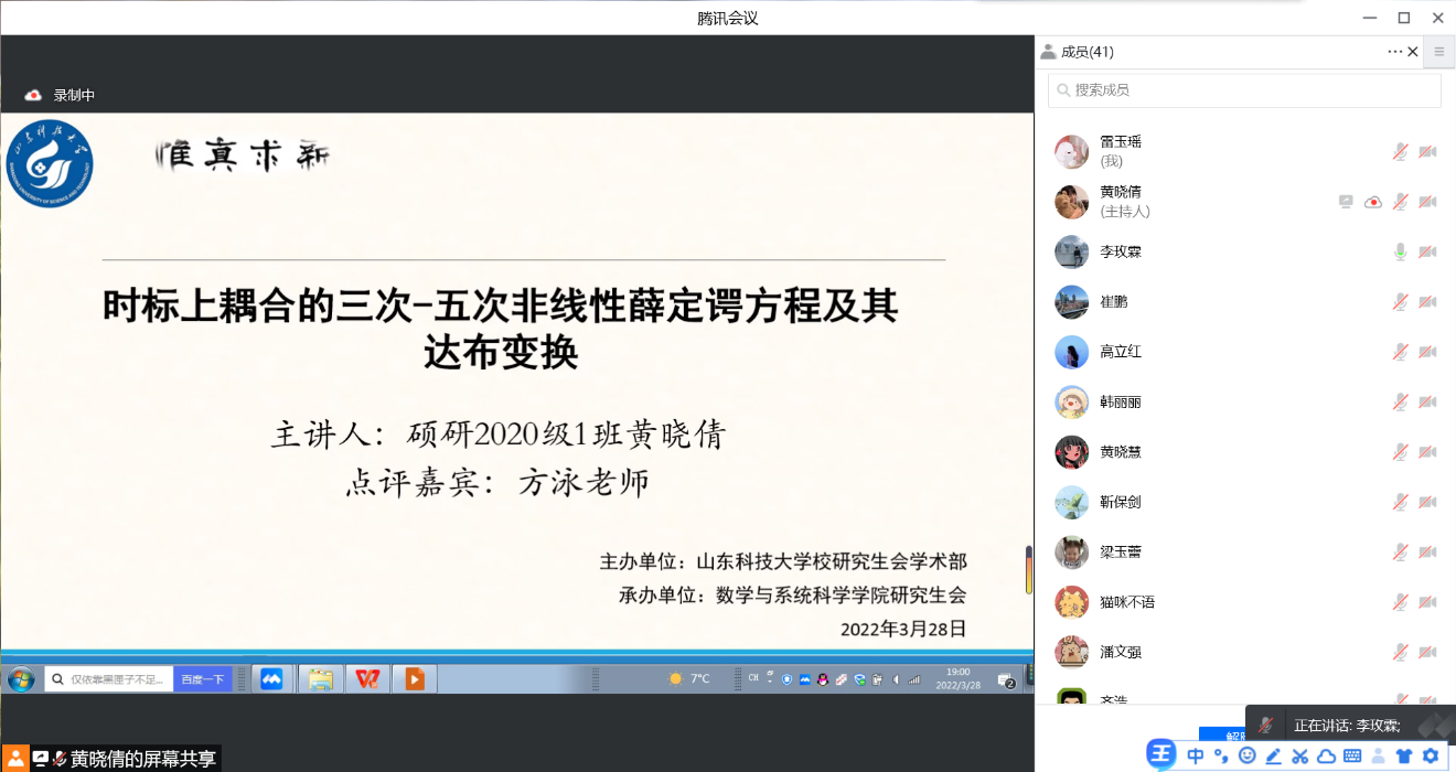 本次讲坛的主题是时标上耦合的三次-五次非线性薛定谔方程及其达布变换。首先,黄晓倩介绍了时标的研究背景,给出时标的研究现状和意义。近年来,时标理论得到了广泛的研究,它是统一各种类型时间变量形式的有力工具, 可以较好地解决包含连续和离散等多种情况的复杂模型。然后,黄晓倩引入时标的基本概念,并给出了一些时标上的定义和运算法则。二十世纪三十到七十年代,E.T.Bell和H. L. Turrittin相继提出微分方程理论和差分方程理论,直到1988年,时标理论首次由著名的数学家 Stefan Hilger 在他的博士论文中提出,并由数学家Bohner 和Peterson 进一步研究和推广。最后,主讲人讲述了耦合的三次-五次非线性薛定谔方程的研究背景及意义,利用Lax对和零曲率方程推导了时标上耦合的三次-五次非线性薛定谔方程并通过达布变换对其求解。