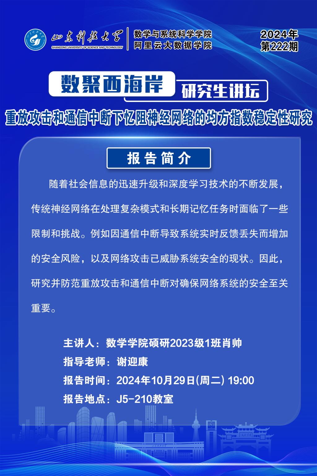 数聚西海岸研究生讲坛2024年第222期:重放攻击和通信中断下忆阻神经网络的均方指数稳定性研究