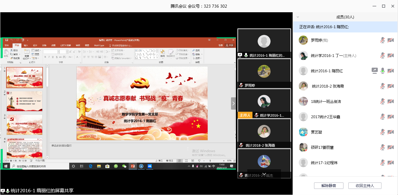 3月31日下午,第十一期“青春党建线上微讲堂”在腾讯会议室举行。本期微讲堂由学生第一党支部党员隋丽红和纪程炜担任主讲,学生第一党支部党员及入党积极分子参加。