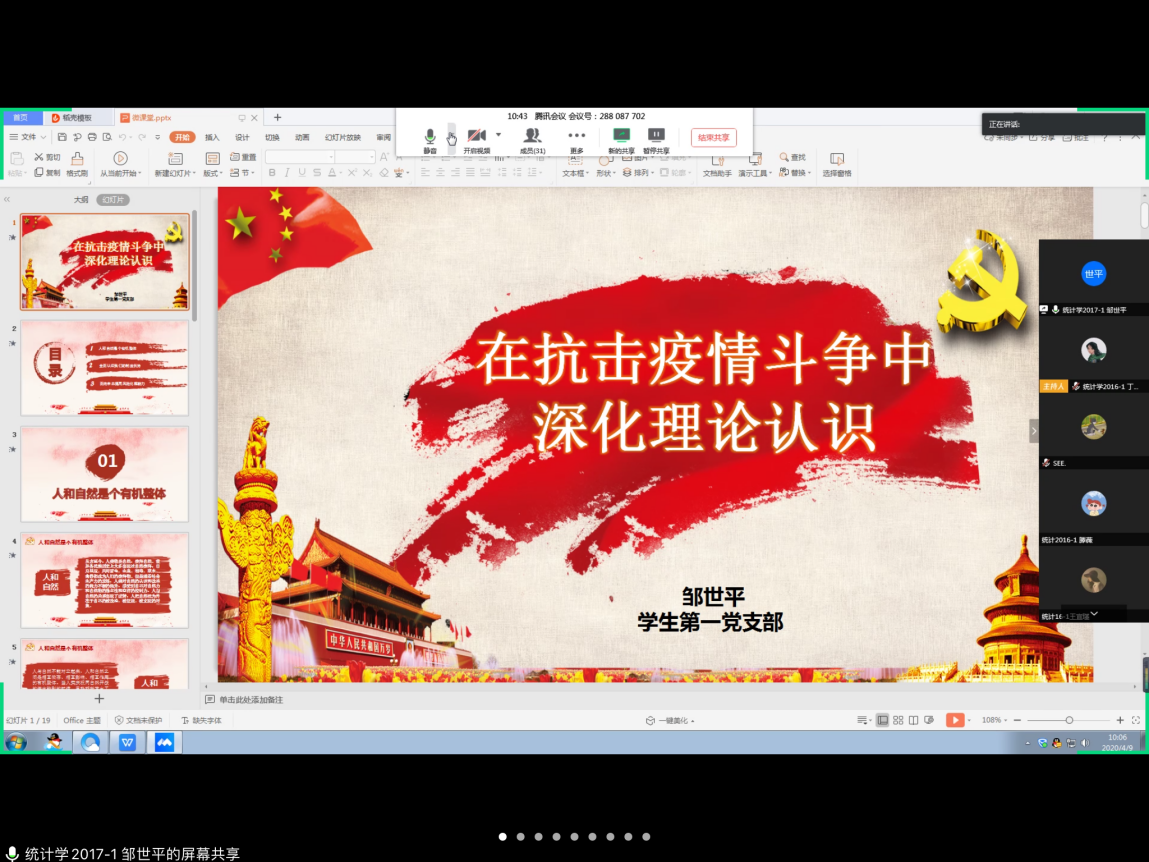 邹世平以“在抗击疫情斗争中深化理论认识”为主题,先是以视频形式带领大家学习了中国制度在战‘疫’中的组织优势,以及我国在抗击疫情上的重要举措,并向大家阐述了保护野生动物、认识自然、敬畏自然的重要性。他表示,作为青年大学生,我们要把这次疫情当作是一种学习的机会,学习前辈们舍己为人的精神,学习专业知识,提高自己的工作能力。