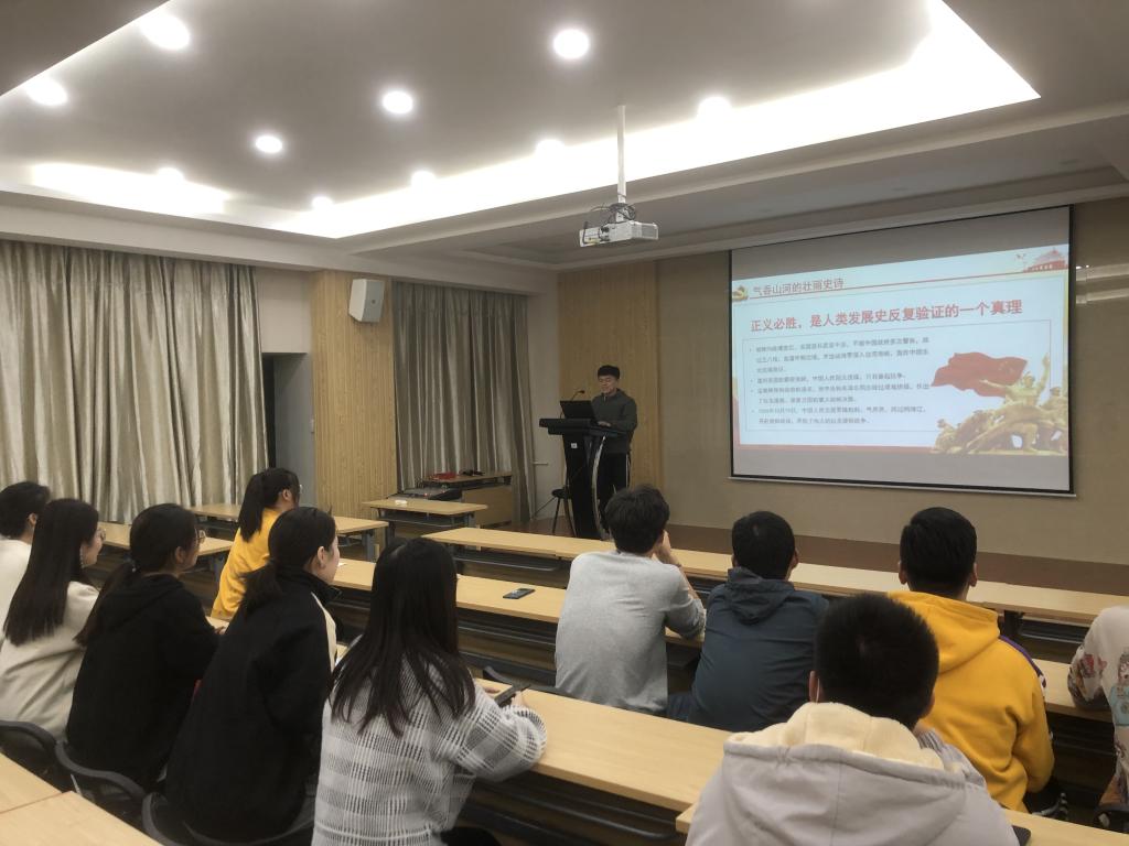 王继秋带领与会同学学习了习近平总书记在纪念中国人民志愿军抗美援朝出国作战70周年大会上的重要讲话精神,温故了抗美援朝战争胜利以来,中国在党的领导下发生的前所未有的历史巨变。任鹏旭介绍了抗美援朝战争的历史背景,号召同学们要以英雄的中国人民志愿军为榜样,学习他们为了祖国和民族而奋不顾身的爱国主义精神。他说,无论时代如何发展,我们都要汇聚万众一心、勠力同心的民族力量,把新时代中国特色社会主义伟大事业不断推向前进!