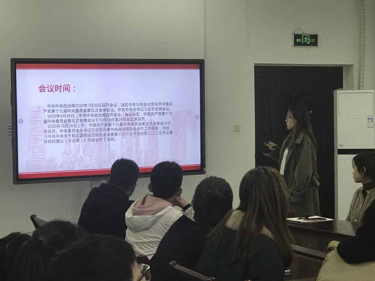 吕琳从“党的十九届五中全会成果”、“党的十九届五中全会公报要点”、“解读党的十九届五中全会精神”三个方面带领同学们进行了学习,她强调本次全会是我国进入新发展阶段、实现中华民族伟大复兴关键时期召开的一次具有全局性、历史性意义的重要会议。希望广大党员能够不忘初心,牢记使命,勇于战胜各种风险挑战,乘着中国特色社会主义的航船继续乘风破浪,坚毅前行。