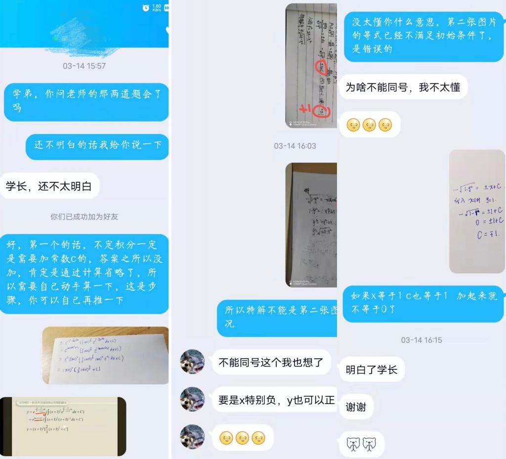3月14日,《高等数学》课程讲到了微分方程的求解这一重难点,课后,大一学生赵景怡联系到党员邵珠浩,“学长,关于微分方程求解的知识点我还有一些疑问,你可以帮我解答一下吗?”邵珠浩不仅认真地解答了问题,还耐心地将知识点进行了梳理,便于赵景怡更好的掌握教学内容。自线上教学启动后,学霸助教团党支部就第一时间对接专业老师,带领全体助教深入云端课堂,认真做好课堂点名、作业批改、课后答疑等,工作覆盖全校321个教学班,101门课程,服务学生9585人次。