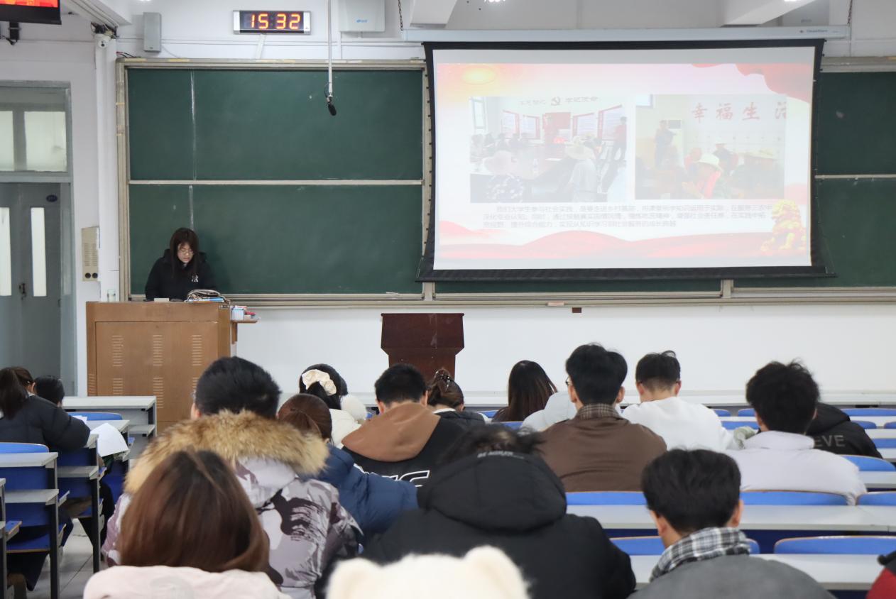 在J14-219教室召开寒假社会实践动员培训会。本次会议邀请蜜枣志愿服务团队负责人白露露主讲,学院全体参与寒假社会实践的同学参会,学生会执行主席王炜嘉主持会议。