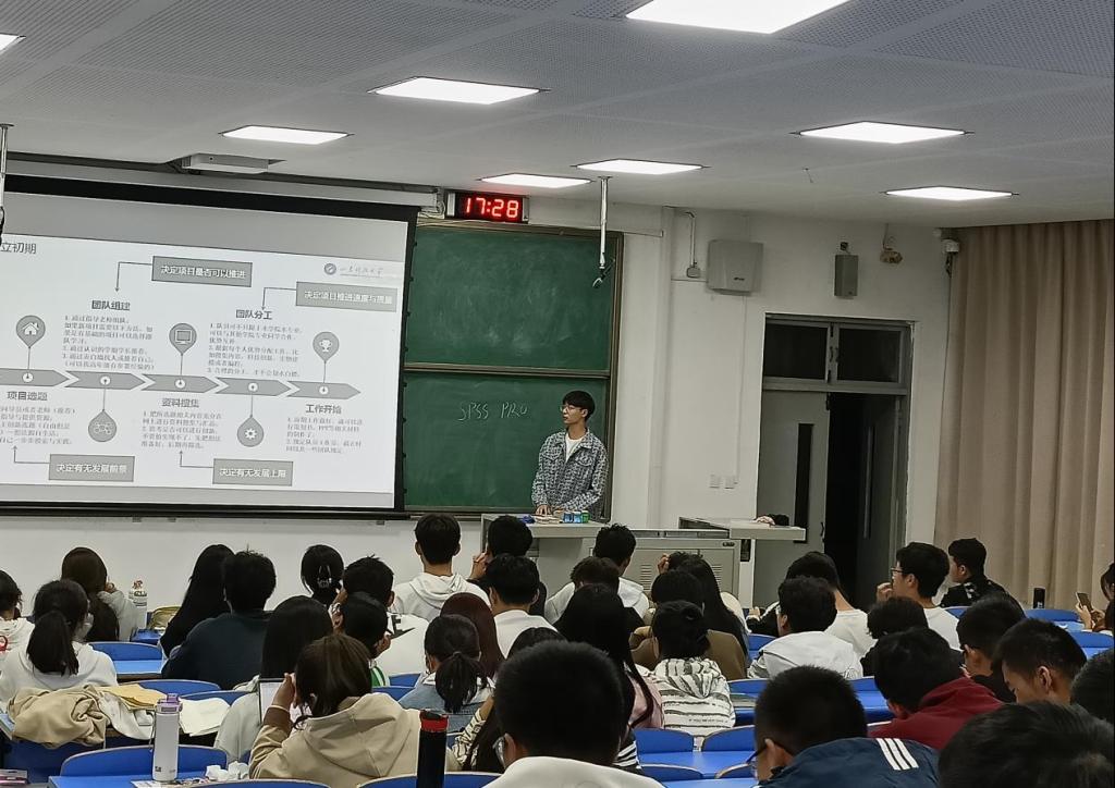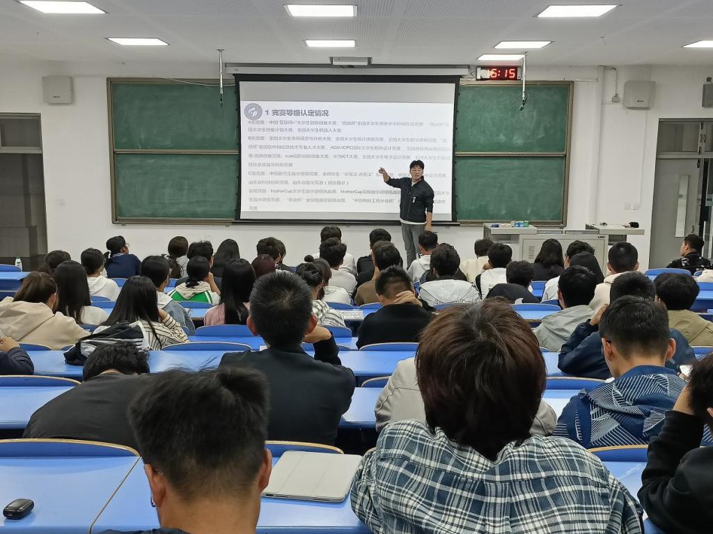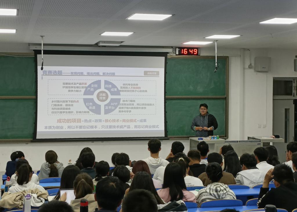 培训会上,代佳庆详细讲解了大学生科技创新竞赛类别等级,并围绕“挑战杯”“互联网+”“全国大学生数学建模竞赛”及“全国大学生市场调查与分析大赛”等赛事,从比赛背景、参赛要求、学院历届获奖情况等方面进行了重点分析,他鼓励同学们在大学期间要制定好自己的学业生涯规划,积极参与科研项目和科创竞赛,提升科学素养和探究能力,为踏上更高人生平台奠定良好基础。