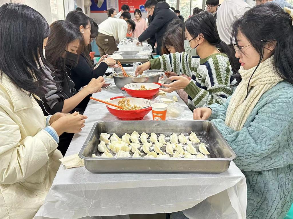 好吃不过饺子,温暖不过团聚。老师和同学们纷纷拿起擀面杖,亲自动手包起了饺子。饺子皮白馅鲜,过程中,同学们开心地分享着家乡的包饺子传统,老师们则纷纷讲述着儿时趣闻,传授着生活经验。一阵忙碌过后,热气腾腾的饺子出锅了,一个个饱满圆润的饺子中蕴含着浓浓的师生情,老师与同学们一边吃饺子一边话家常,现场欢声笑语,其乐融融。