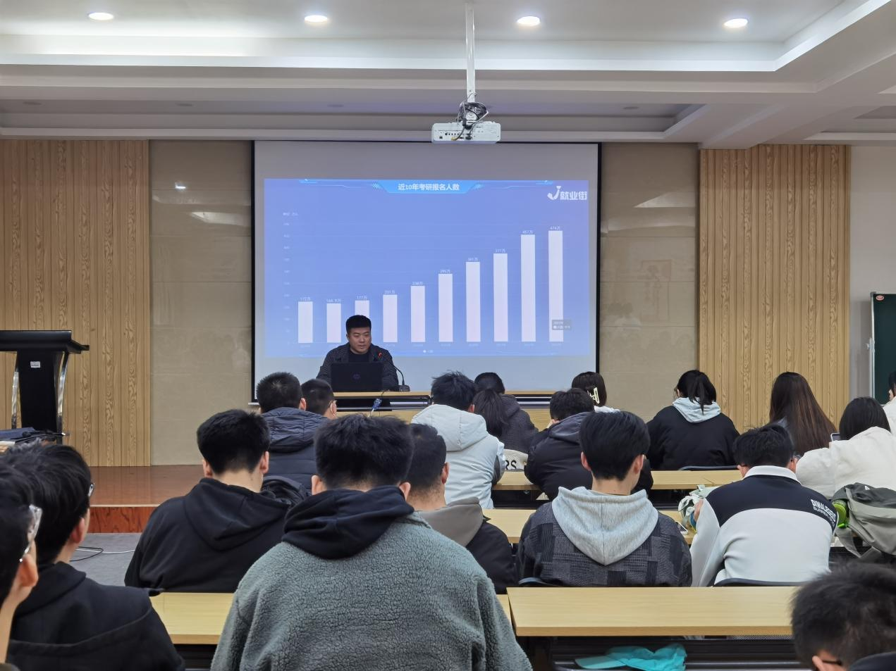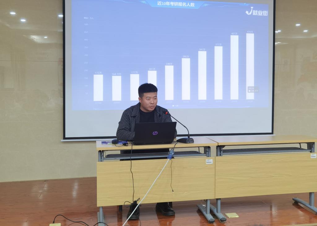 丁鹏结合近十年高校毕业生人数、考研报名人数等分析了当前就业形势,并结合日常工作中的所见所闻所感,为在座学生从升学、考公、创业、留学、求职等不同就业方向的优劣势进行详细解读。他通过分析近两年求职毕业生开始找工作的时间分布、全国各大行业新发职位发布以及2023年企业招人的策略变化帮助和引导学生做好职业生涯规划。丁鹏鼓励同学们珍惜难得的在校时光,努力提升自身综合素质,要相信付出就会有收获。