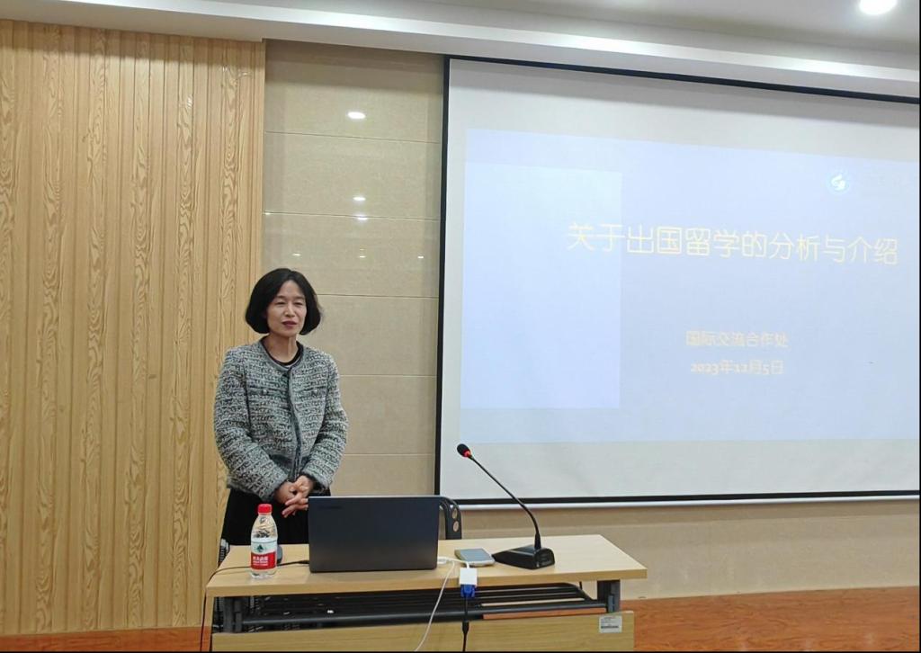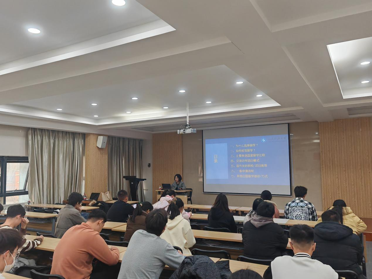 邀请学校国际交流处刘洁老师在J9-433报告厅为学生作出国(境)留学分析与项目推介。讲座由学院学工办主任、团委书记谢菲菲主持。