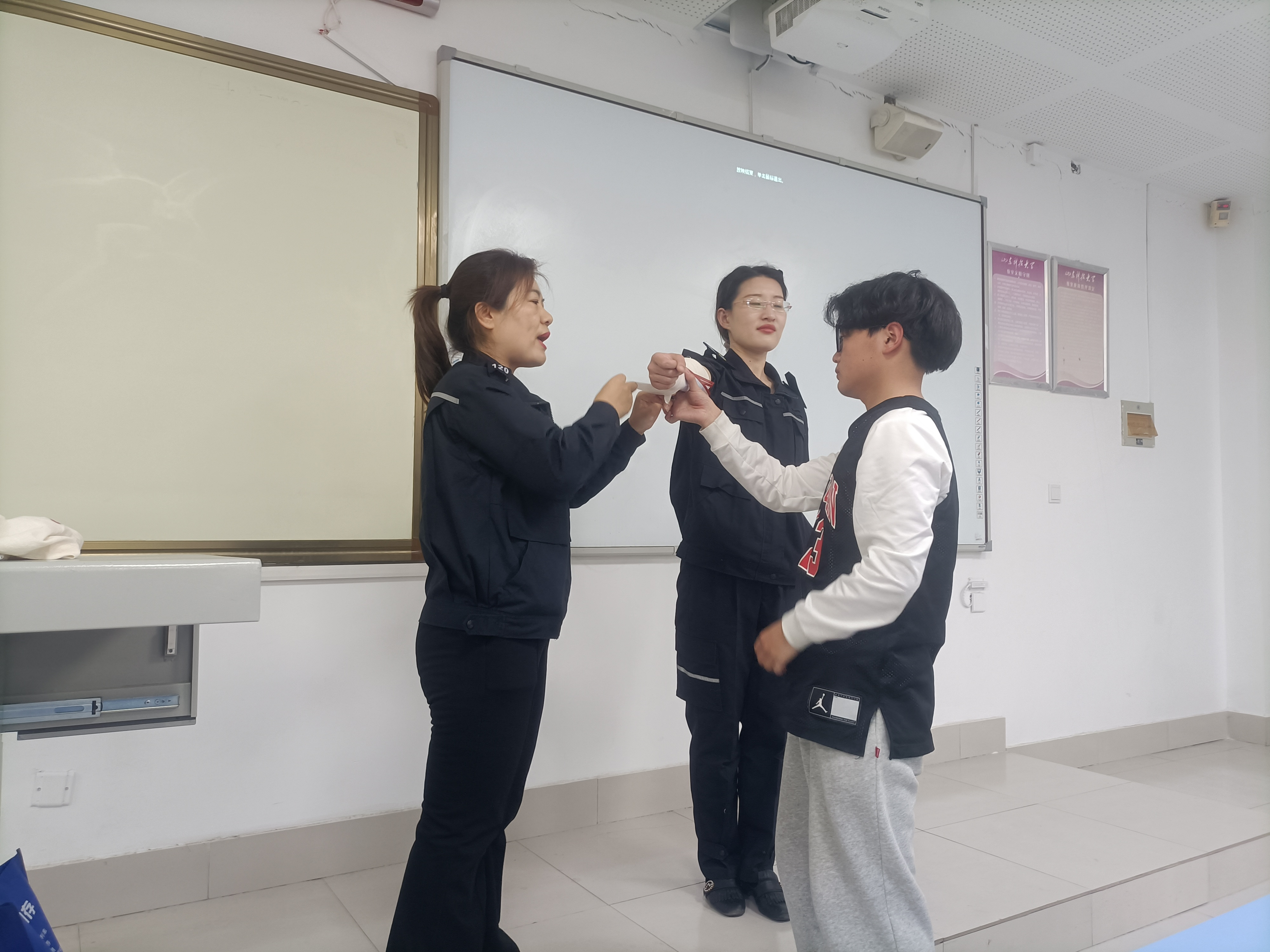 培训中,陈璇系统讲解和现场演示了现场外伤的急救处理的技巧,包含外伤止血术、外伤包扎术、外伤固定术、外伤搬运术等。梁爽针对骨折搬运、大面积擦伤等问题进行了深入浅出的讲解,并对发生鼻出血、脚踝扭伤等情况之后我们通常会采取的错误做法进行纠正,同时演示了正确的处理方式。在实操练习环节中,同学们争相练习,模拟外伤发生时应采取的急救操作,两位老师也给予了细心的指导,将实际操作与理论知识相结合,力求让现场的每一名同学切实掌握外伤应急救护知识和技能。