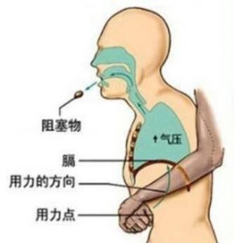 其原理是快速冲击腹部使膈肌突然上升、胸腔压力骤然增加,驱使肺部残留空气形成一股气流,这股带有冲击性和方向性的气流,就能将堵在气管、喉部的异物驱除,使人获救。