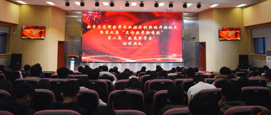 在J9-144报告厅隆重举行数学与应用数学专业拔尖创新班开班仪式暨第九届“吴方数学新秀奖”、第二届数愿奖学金颁奖典礼。数学78级校友、原齐鲁工业大学副校长(山东省科学院副院长)、吴方新秀奖学金理事会理事长贺国平,校党委常委、副校长曾庆田,教务处处长乔卫国,学生工作处副处长孔环,合作发展处副处长王荣超,比分网足球