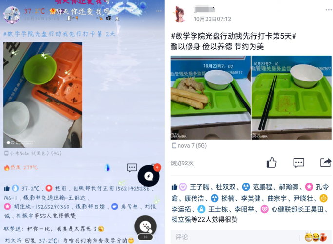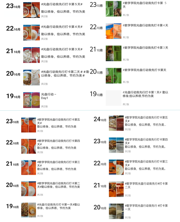 “勤以修身,俭以养德,节约为美”、“谁知盘中餐,粒粒皆辛苦”...同学们按照活动要求,在规定的时间内,通过微信朋友圈或QQ空间等平台打卡分享自己的“光盘”照片。线上活动结束后,还开展了抽取奖品活动,对优秀参与者进行表彰和奖励。