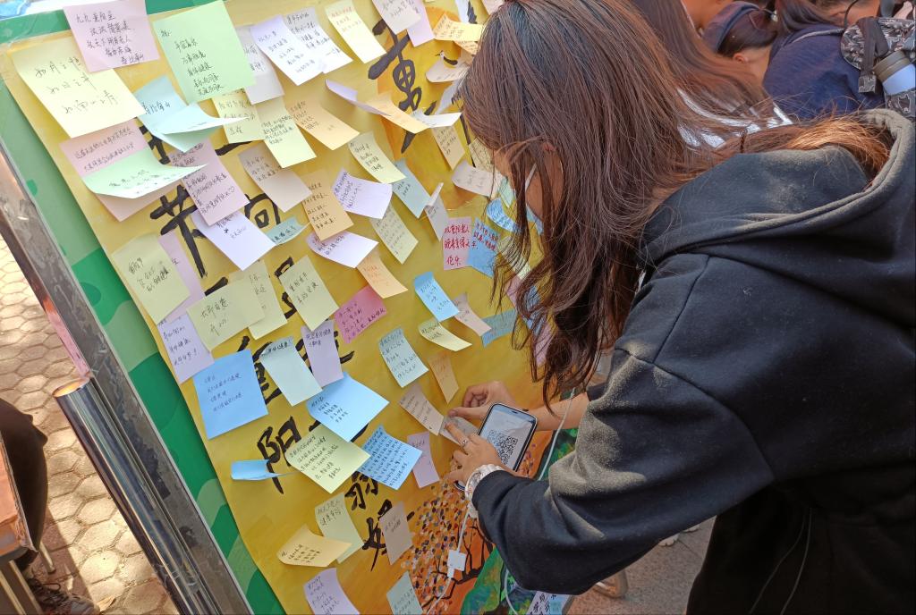 活动现场,人头攒动,参与学生络绎不绝,同学们在提前准备好的便利贴和展板上写下自己对老年人最热切的关心和最真挚的祝福。“又是九月九,重阳节,难聚首,思念您的孩儿漂流在外头”、“让秋风带去我的问候,让秋雨诉说我的思念,在这里送上我的祝福:又到九九重阳,祝您健康、开心、快乐!”,一字字,一句句,同学们用心传递温暖,用行动传递爱心。