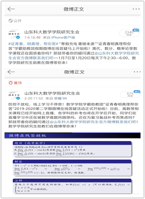 随着网络课程的开播,学院学霸助教团新学期的“证青春·明真理·帮你答”微博在线答疑活动也已同步启动。学霸助教们在线为同学们直播学习和复习备考中遇到的数学难题答疑。接下来,大学数学教学团队将继续加强线上教学答疑模式探索,确保疫情期间的教学质量和学习效果,学霸助教团微博答疑也将一直在线等你。同心战“疫”,共克时艰,我们坚信疫情终将过去,定会春暖花开!(通讯员:刘洪霞  谢菲菲)