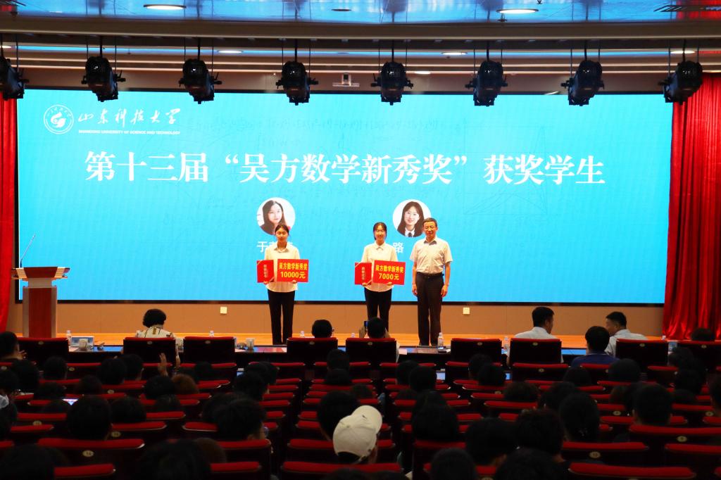 院长董焕河宣读了第十三届“吴方数学新秀奖”等奖学金表彰决定。与会领导为“吴方数学新秀奖”“青软奖学金”“正则拔尖班奖学金”“数学95助学金”获奖学生颁奖。“吴方数学新秀奖”获奖学生于莹莹作代表发言。