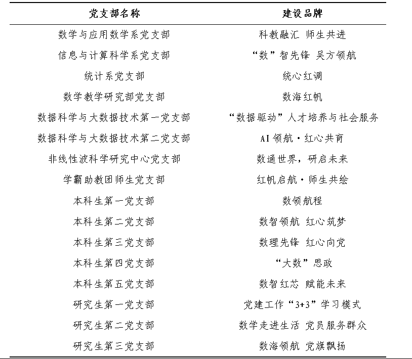 学院党委制定“一支部一品牌”创建实施方案,构建“立项-培育-验收-评优”全流程工作机制,引导16个党支部立足学科专业优势凝练特色品牌,深化推进党建工作与业务工作“双融双促”,打造一批具有数学学科特色、可复制推广的党建品牌,全面提升党建工作引领力、服务力和影响力。