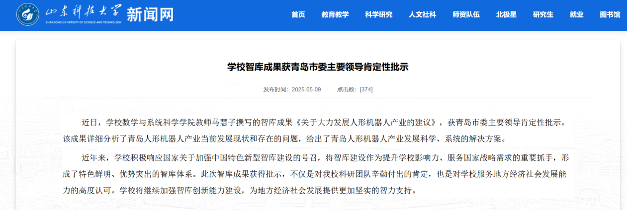 学院教师智库成果获青岛市委主要领导肯定性批示