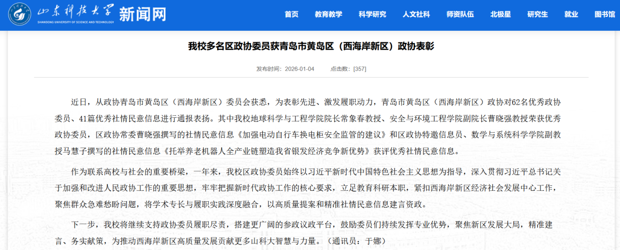 学院教师撰写社情民意获评青岛市黄岛区(西海岸新区)政协优秀社情民意信息
