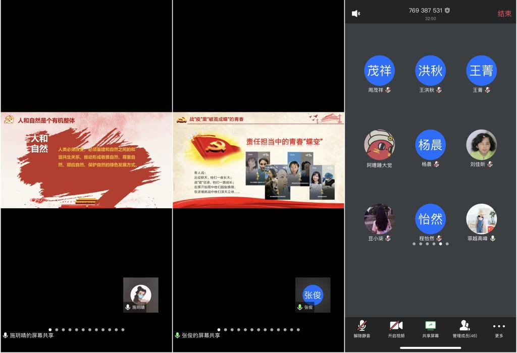 施玥晴分享了她对清华大学艾教授的战“疫”公开课的所思所感。她强调,人和自然是一个有机整体。“为了避免警钟变丧钟,人类必须改变,必须重建和自然之间的和谐共生关系。”艾教授的话掷地有声,发人深省。施玥晴表示,作为大学生,我们要充分地认识人与自然的关系,要做到拒绝购买保护名录中的野生动植物工艺品,举报非法捕猎、交易野生动物的行为,积极开展相关知识的宣传教育等,让自己及他人的生活方式变得更加绿色环保,健康文明。