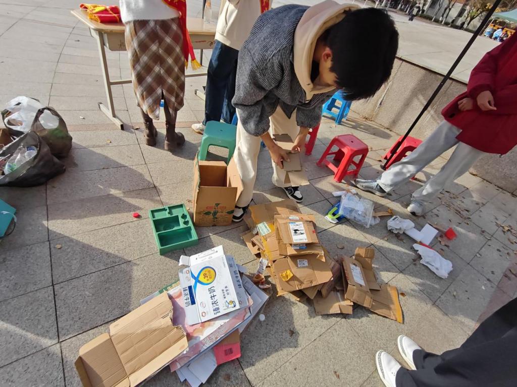 此次活动聚焦于日常生活中的饮料瓶子以及“双十一”高峰期快递盒堆积问题,号召同学们收集自己、舍友与路边遗弃的快递盒和饮料瓶集中进行分类及归纳,在收集完成后,由权益部统一放置处理。活动期间,同学们积极响应,踊跃报名参与,我院志愿者认真进行可回收物的分类和整理工作。