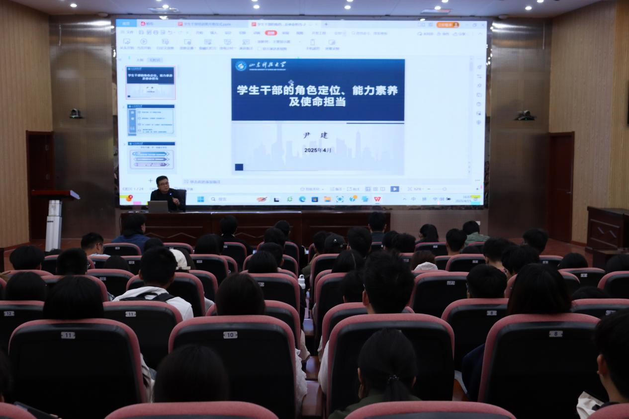 尹建以《学生干部的角色定位、能力素养和使命担当》为题作开班第一讲,他以学生干部的职责与重要性为切入点,围绕角色定位、能力素养、使命担当三个方面对如何当好学生干部、如何做好学生工作展开讲解。他指出,学生干部是大学校园中师生间的“桥梁纽带”、行动中的“榜样灯塔”、服务中的“贴心管家”、成长中的“自我管理者”,肩负着重要的责任和使命。广大学生干部要提升能力素养,在“大时代”与“小舞台”间扛牢使命担当,书写青春答卷。他要求,全体学生干部以身作则,为广大学生树立榜样,全心全意为同学服务,用实干和担当提境界、练本领、锻意志,为学校的发展贡献青春力量。