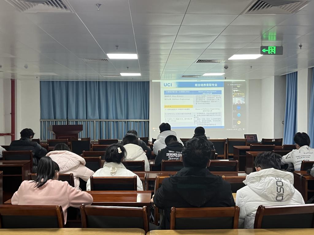 12月2日晚,比分网足球 组织有出国留学意向的学生在工程实训大楼1603会议室集中观看了加州大学欧文分校的留学项目线上直播推介会。