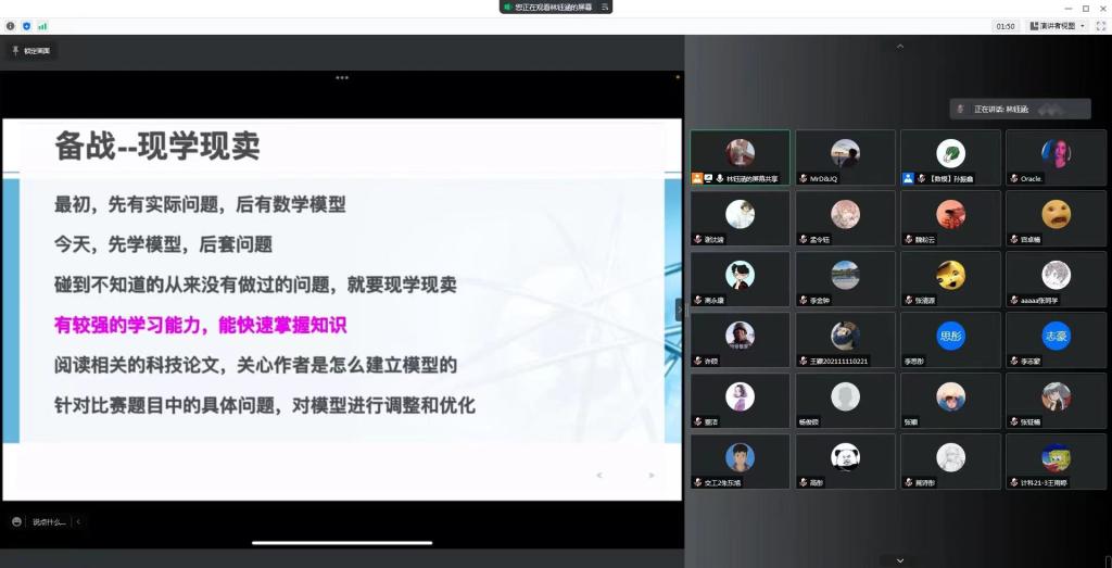 线上培训会活动中,协会指导教师王新赠和会长林钰涵等分别介绍了数学建模基础知识及软件应用等相关知识,同时从备战方法、团队合作、论文规范等方面对同学们进行细致培训,并鼓励同学们要积极参赛,将数学知识融入到竞赛的各个环节,进一步提高数学思维能力,培训会累计参与人员700余人。